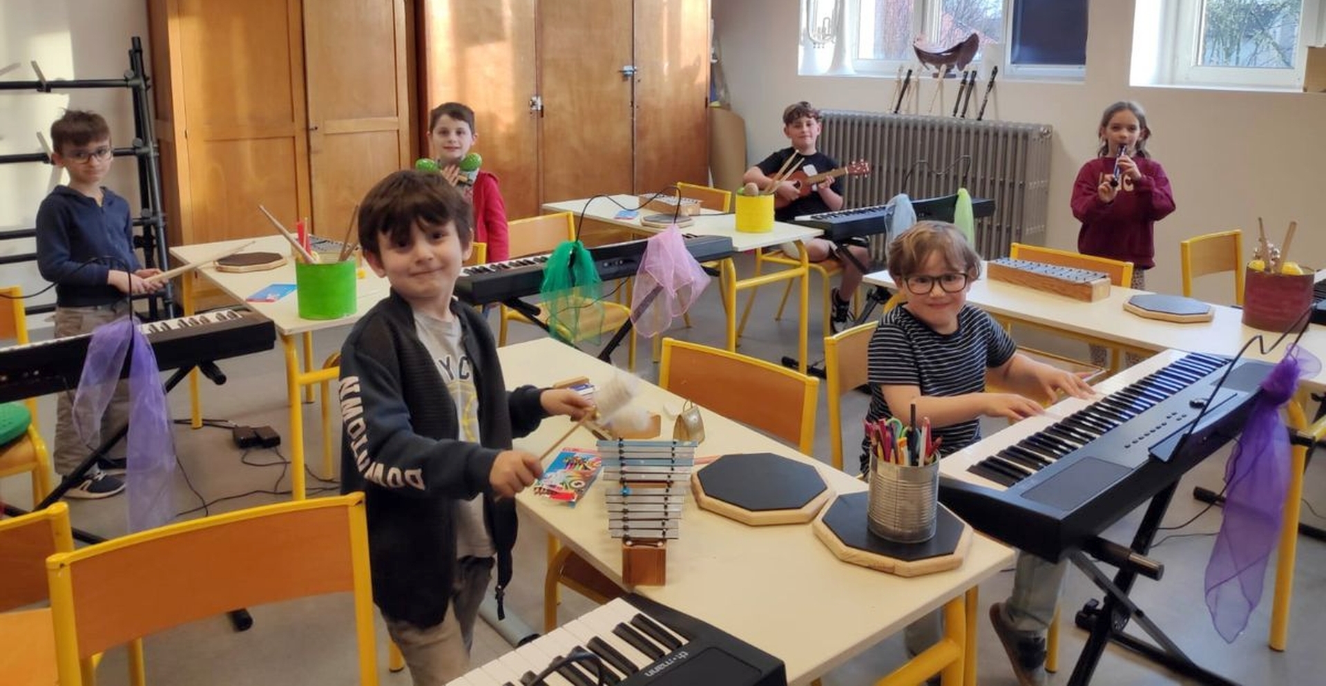 Cet atelier peut accueillir 8 à 10 enfants à partir de 6 ans, qui auront chacun à leur disposition un laboratoire constitué d’un piano, d’un ukulélé, d’une flûte, d’un pad de batterie avec des baguettes.Ils pourront ainsi apprendre le langage musical tout en pratiquant les divers instruments proposés. Cet atelier est parfait pour les enfants qui ne savent pas trop quel instrument choisir ou pour découvrir d’autres.